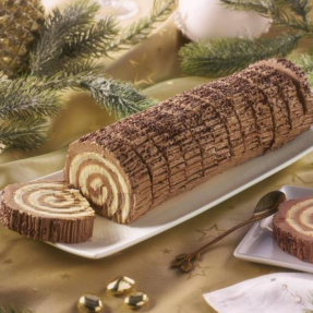 790g, génoise nature imbibée de sirop vanille enroulée, garniture au cacao, décor stries et copeaux de chocolat, sans gélatine animale, coupée en 14 parts,