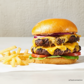 Préparation surgelée à base de préparation cuite de viande hachée de bœuf, de pain spécial, de sauce, de fromage fondu et de tomate ( burger )