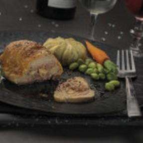 Haut de cuisse de poulet jaune désossé avec peau, farce à base de poulet, de foie gras de canard et de morceaux de pomme.