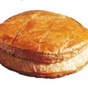 90 g, Ø 10 cm, à cuire, pâte feuilletée pur beurre fourrée à la frangipane (33 % dont amande 6.5 % et arôme naturel de vanille), prédorée à l'oeuf, 5 fèves et 5 couronnes par carton, élaboré Bretagne. Sans alcool.