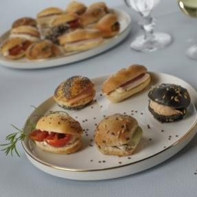 | Description | Sur plateau noir de 35 pièces - 6 variétés :poivrons rouge courgette, 10 mini-sandwichs jambon comté, 5 mini-sandwichs aiguillettes de canard, 5 mini-sandwichs oignon chèvre tomate cerise, 5 mini-sandwichs thon red thai curry et 5 mini-sandwichs truite fumée raifort -élaboré Normandie. Carton: 4 plateaux |