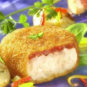 Moulé de filets de Colin d'Alaska et poisson blanc MSC sans arêtes, avec sauce tomate, pané, préfrit, cuit, surgelé.