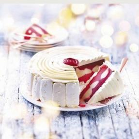 Sorbet plein fruit framboise 31,5%, sorbet plein fruit poire vanillée 27% et sorbet plein fruit cassis 19%, décor crème fouettée vanillée 14%, meringue 8%. Décor sceau 0,5%.